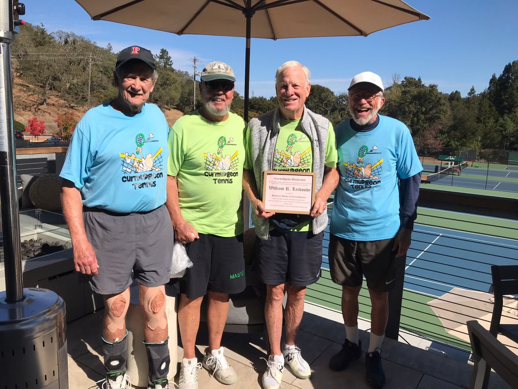 One of the founding members of Curmeudgeon tennis has unfortunately decided that either the competition is too tough, or the weather is too good for him. Bill “I can bounce the ball over the net 999 times out of 1000” Leckonby is moving to Rossmoor (I assume because he has the smart sense to follow his wife Judy, who is much too good for him.) Out of a sense of respect, honor, and pity, he has been awarded an Honorary Doctor of Curmudgeonry.